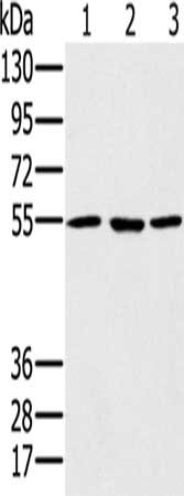 Gel: 8%SDS-PAGE, Lysate: 40 μg, Lane 1-3: A549 cells, hela cells, NIH/3T3 cells, Primary antibody: CSB-PA098589(PSMC1 Antibody) at dilution 1/500, Secondary antibody: Goat anti rabbit IgG at 1/8000 dilution, Exposure time: 20 seconds
