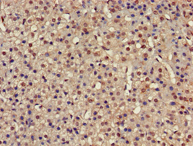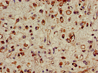 IHC image of CSB-PA018894LA01HU diluted at 1:500 and staining in paraffin-embedded human glioma performed on a Leica BondTM system. After dewaxing and hydration, antigen retrieval was mediated by high pressure in a citrate buffer (pH 6.0). Section was blocked with 10% normal goat serum 30min at RT. Then primary antibody (1% BSA) was incubated at 4°C overnight. The primary is detected by a biotinylated secondary antibody and visualized using an HRP conjugated SP system.