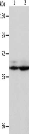 Gel: 8%SDS-PAGE, Lysate: 40 μg, Lane 1-2: Hela cells, Jurkat cells, Primary antibody: CSB-PA928820(PSMD3 Antibody) at dilution 1/300, Secondary antibody: Goat anti rabbit IgG at 1/8000 dilution, Exposure time: 5 seconds