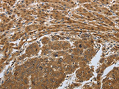 The image on the left is immunohistochemistry of paraffin-embedded Human liver cancer tissue using CSB-PA643972(PSMD6 Antibody) at dilution 1/50, on the right is treated with synthetic peptide. (Original magnification: ×200)