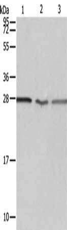 Gel: 12%SDS-PAGE, Lysate: 40 μg, Lane 1-3: Jurkat cells, A549 cells, Human fetal kidney tissue, Primary antibody: CSB-PA212713(PSMD9 Antibody) at dilution 1/750, Secondary antibody: Goat anti rabbit IgG at 1/8000 dilution, Exposure time: 10 seconds