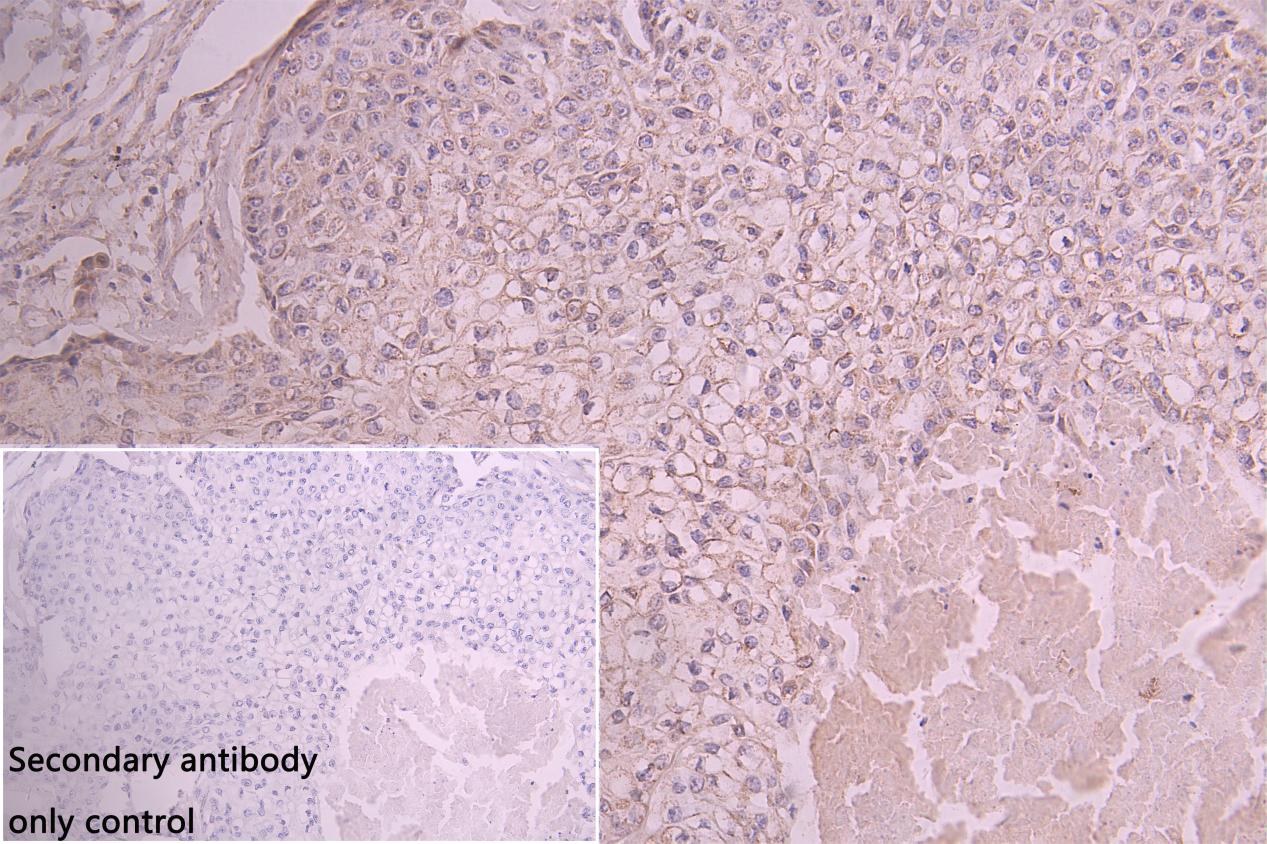 IHC image of CSB-PA04305A0Rb diluted at 1:150 and staining in paraffin-embedded humanpancreatic cancer performed on a Leica BondTM system. After dewaxing and hydration, antigen retrieval was mediated by high pressure in a citrate buffer (pH 6.0). Section was blocked with 10% normal goat serum 30min at RT. Then primary antibody (1% BSA) was incubated at 4°C overnight. The primary is detected by a Goat anti-rabbit polymer IgG labeled by HRP and visualized using 0.05% DAB. Secondary antibody only control: uses 1% BSA instead of primary antibody