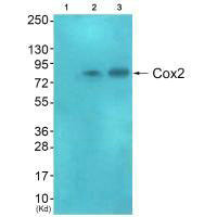 Western blot analysis of extracts from HeLa cells (Lane 2), and A549 cells (Lane 3), using Cox2 antiobdy. The lane on the left is treated with systhesized peptide.
