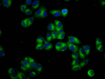 Immunofluorescence staining of Hela cells with CSB-PA769809LA01HU at 1:66, counter-stained with DAPI. The cells were fixed in 4% formaldehyde, permeabilized using 0.2% Triton X-100 and blocked in 10% normal Goat Serum. The cells were then incubated with the antibody overnight at 4°C. The secondary antibody was Alexa Fluor 488-congugated AffiniPure Goat Anti-Rabbit IgG(H+L).