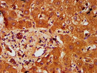 IHC image of CSB-PA769809LA01HU diluted at 1:200 and staining in paraffin-embedded human liver tissue performed on a Leica BondTM system. After dewaxing and hydration, antigen retrieval was mediated by high pressure in a citrate buffer (pH 6.0). Section was blocked with 10% normal goat serum 30min at RT. Then primary antibody (1% BSA) was incubated at 4°C overnight. The primary is detected by a biotinylated secondary antibody and visualized using an HRP conjugated SP system.