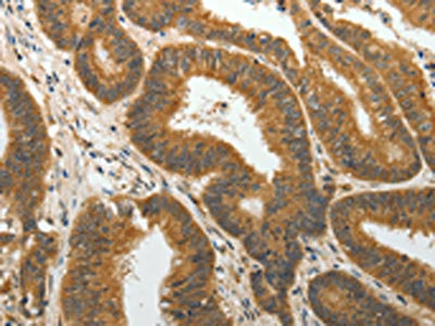 The image on the left is immunohistochemistry of paraffin-embedded Human colon cancer tissue using CSB-PA350868(PTP4A2 Antibody) at dilution 1/25, on the right is treated with fusion protein. (Original magnification: ×200)
