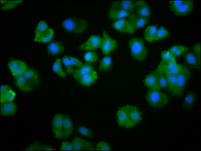 Immunofluorescence staining of HepG2 cells with CSB-PA019036LA01HU at 1:266, counter-stained with DAPI. The cells were fixed in 4% formaldehyde, permeabilized using 0.2% Triton X-100 and blocked in 10% normal Goat Serum. The cells were then incubated with the antibody overnight at 4°C. The secondary antibody was Alexa Fluor 488-congugated AffiniPure Goat Anti-Rabbit IgG(H+L).