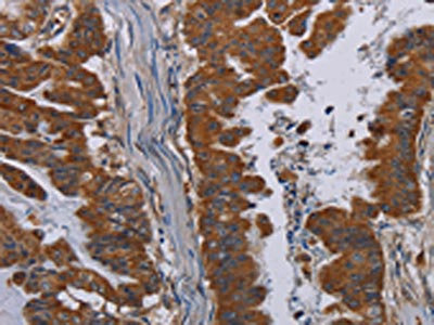 The image on the left is immunohistochemistry of paraffin-embedded Human colon cancer tissue using CSB-PA250008(PVRL3 Antibody) at dilution 1/40, on the right is treated with fusion protein. (Original magnification: ×200)