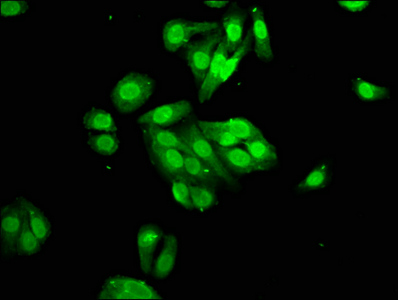 Immunofluorescence staining of HepG2 cells with CSB-PA883586LA01HU at 1:100, counter-stained with DAPI. The cells were fixed in 4% formaldehyde, permeabilized using 0.2% Triton X-100 and blocked in 10% normal Goat Serum. The cells were then incubated with the antibody overnight at 4°C. The secondary antibody was Alexa Fluor 488-congugated AffiniPure Goat Anti-Rabbit IgG(H+L).