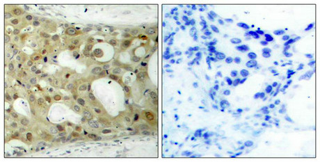 Immunohistochemical analysis of paraffin-embedded human breast carcinoma tissue using Androgen Receptor (Phospho-Ser650) Antibody (left) or the same antibody preincubated with blocking peptide (right).