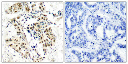 Immunohistochemical analysis of paraffin-embedded human breast carcinoma tissue using ATM(Phospho-Ser1981) Antibody(left) or the same antibody preincubated with blocking peptide(right).