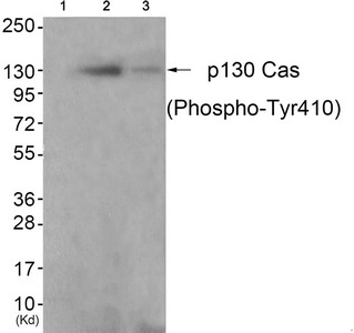 Western blot analysis of extracts from K562 cells (Lane 2) and 3T3 cells (Lane 3), using P130 Cas(Phospho-Tyr410) Antibody. The lane on the left is treated with antigen-specific peptide.