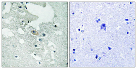 Immunohistochemistry analysis of paraffin-embedded human brain tissue using BLNK (Phospho-Tyr84) antibody. The picture on the right is treated with the synthesized peptide.