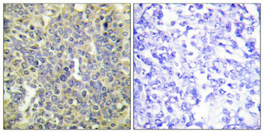 Immunohistochemical analysis of paraffin-embedded human lung carcinoma tissue using Caspase 9 (Phospho-Thr125) antibody (left)or the same antibody preincubated with blocking peptide (right).