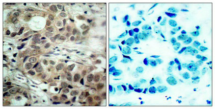 Immunohistochemical analysis of paraffin-embedded human breast carcinoma tissue using cdc25C(Phospho-Ser216) Antibody(left) or the same antibody preincubated with blocking peptide(right).