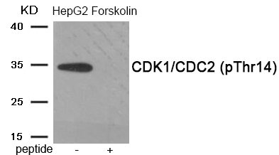 免疫原:Peptide sequence around phospho rylation site of threonine14(E-G-T(p)-Y-G) derived from Human CDK1/CDC2 .
