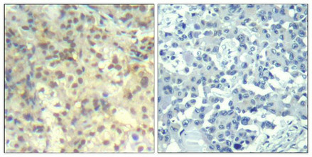 純化方式:Antibodies were produced by immunizing rabbits with synthetic phosphopeptide and KLH conjugates. Antibodies were purified by affinity-chromatography using epitope-specific phosphopeptide. Non-phospho specific antibodies were removed by chromatogramphy usi