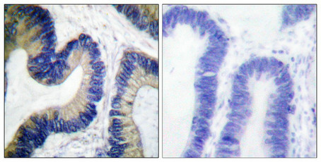 mmunohistochemical analysis of paraffin-embedded human colon carcinoma tissue using 4E-BP1 (Phospho-Ser64) antibody. The picture on the right is treated with the synthesized peptide.