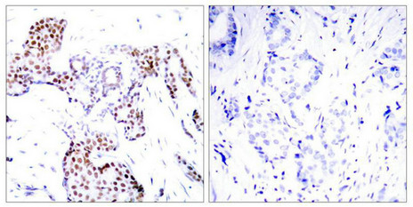 Immunohistochemical analysis of paraffin-embedded human breast carcinoma tissue using Elk1(Phospho-Ser389) Antibody(left) or the same antibody preincubated with blocking peptide(right).