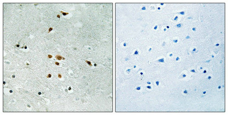 Immunohistochemical analysis of paraffin-embedded human brain tissue using FER (Phospho-Tyr402) antibody (left)or the same antibody preincubated with blocking peptide (right).