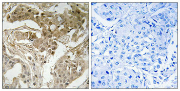 Immunohistochemical analysis of paraffin-embedded human breast carcinoma tissue using FOS (Phospho-Thr232) antibody (left)or the same antibody preincubated with blocking peptide (right).