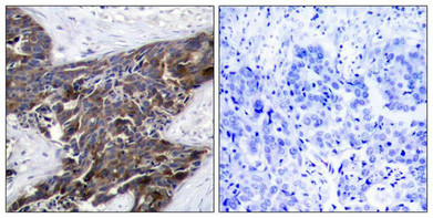 Immunohistochemical analysis of paraffin-embedded human breast carcinoma tissue using Connexin 43(Phospho-Ser367) Antibody(left) or the same antibody preincubated with blocking peptide(right).