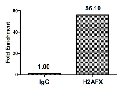 Chromatin Immunoprecipitation Hela (4*106) were treated with Micrococcal Nuclease, sonicated, and immunoprecipitated with 5µg anti-H2AFX (CSB-PA010097OA139phHU) or a control normal rabbit IgG. The resulting ChIP DNA was quantified using real-time PCR with primers against the β-Globin promoter.