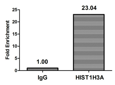 Chromatin Immunoprecipitation Hela (4*106) were treated with Micrococcal Nuclease, sonicated, and immunoprecipitated with 5µg anti-HIST1H3A (CSB-PA010418OA80phHU) or a control normal rabbit IgG. The resulting ChIP DNA was quantified using real-time PCR with primers against the β-Globin promoter.