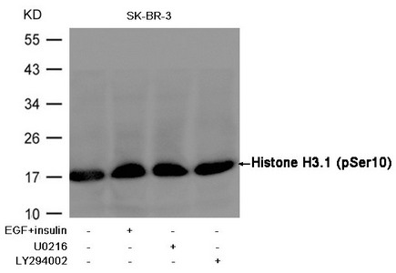 Western blot analysis of extracts from SK-BR-3 cells, treated with insulin and EGF, and pretreated with U0126 and LY294002 cells using Histone H3.1 (Phospho-Ser10) Antibody.