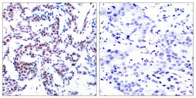 Immunohistochemical analysis of paraffin-embedded human breast carcinoma tissue using JunB(Phospho-Ser259) Antibody(left) or the same antibody preincubated with blocking peptide(right).