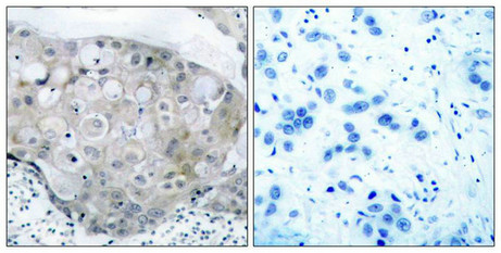 Immunohistochemical analysis of paraffin-embedded human breast carcinoma tissue using VEGFR2(Phospho-Tyr951) Antibody(left) or the same antibody preincubated with blocking peptide(right).