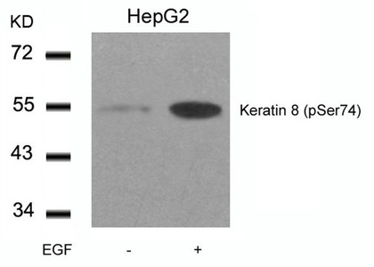 Western blot analysis of extracts from HepG2 cells untreated or treated with EGF using Keratin 8(Phospho-Ser74) Antibody.