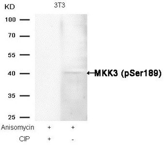 Western blot analysis of extracts from 3T3 cells, treated with Anisomycin or calf intestinal phosphatase (CIP), using MKK3 (Phospho-Ser189) Antibody.