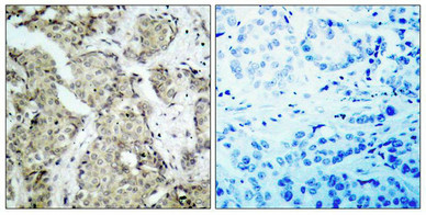Immunohistochemical analysis of paraffin- embedded human breast carcinoma tissue using MKK6(Phospho-Ser207) Antibody(left) or the same antibody preincubated with blocking peptide(right).