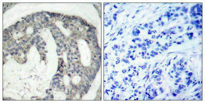 Immunohistochemical analysis of paraffin-embedded human breast carcinoma tissue using eNOS(Phospho-Ser1177) Antibody(left) or the same antibody preincubated with blocking peptide(right).