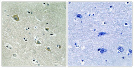 Immunohistochemical analysis of paraffin-embedded human brain tissue using PAK1 (Phospho-Ser204) antibody (left)or the same antibody preincubated with blocking peptide (right).