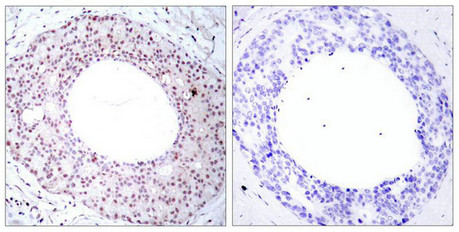Immunohistochemical analysis of paraffin-embedded human breast carcinoma tissue using NFkB-p65(Phospho-Thr254) Antibody(left) or the same antibody preincubated with blocking peptide(right).