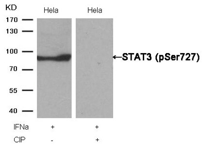 Western blot analysis of extracts from Hela cells, treated with IFNa or calf intestinal phosphatase (CIP), using STAT3 (Phospho-Ser727) Antibody.