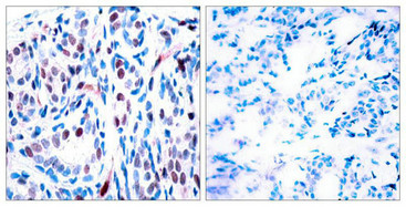 Immunohistochemical analysis of paraffin-embedded human breast carcinoma tissue using STAT3 (Phospho-Tyr705) Antibody (left) or the same antibody preincubated with blocking peptide (right).