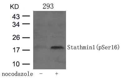 Western blot analysis of extracts from 293 cells untreated or treated with Nocodazol using Stathmin 1(Phospho-Ser16) Antibody.