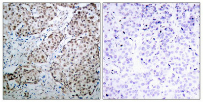 Immunohistochemical analysis of paraffin-embedded human breast carcinoma tissue using p53(Phospho-Ser315) Antibody(left) or the same antibody preincubated with blocking peptide(right).