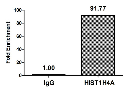 Chromatin Immunoprecipitation Hela (4*106, treated with 10mM sodium propionate for 4h) were treated with Micrococcal Nuclease, sonicated, and immunoprecipitated with 5µg anti-HIST1H4A (CSB-PA010429OA31propHU) or a control normal rabbit IgG. The resulting ChIP DNA was quantified using real-time PCR with primers against the β-Globin promoter.
