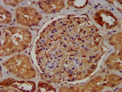 IHC image of CSB-PA863141LA01HU diluted at 1:400 and staining in paraffin-embedded human kidney tissue performed on a Leica BondTM system. After dewaxing and hydration, antigen retrieval was mediated by high pressure in a citrate buffer (pH 6.0). Section was blocked with 10% normal goat serum 30min at RT. Then primary antibody (1% BSA) was incubated at 4°C overnight. The primary is detected by a biotinylated secondary antibody and visualized using an HRP conjugated SP system.