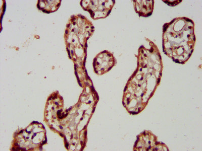 IHC image of CSB-PA863141LA01HU diluted at 1:400 and staining in paraffin-embedded human placenta tissue performed on a Leica BondTM system. After dewaxing and hydration, antigen retrieval was mediated by high pressure in a citrate buffer (pH 6.0). Section was blocked with 10% normal goat serum 30min at RT. Then primary antibody (1% BSA) was incubated at 4°C overnight. The primary is detected by a biotinylated secondary antibody and visualized using an HRP conjugated SP system.