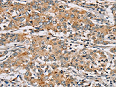 The image on the left is immunohistochemistry of paraffin-embedded Human liver cancer tissue using CSB-PA071446(RAB24 Antibody) at dilution 1/45, on the right is treated with synthetic peptide. (Original magnification: ×200)