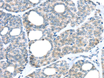 The image on the left is immunohistochemistry of paraffin-embedded Human thyroid cancer tissue using CSB-PA051869(RAB24 Antibody) at dilution 1/45, on the right is treated with synthetic peptide. (Original magnification: ×200)