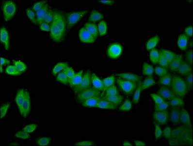 Immunofluorescence staining of PC-3 cells with CSB-PA842627LA01HU at 1:133, counter-stained with DAPI. The cells were fixed in 4% formaldehyde, permeabilized using 0.2% Triton X-100 and blocked in 10% normal Goat Serum. The cells were then incubated with the antibody overnight at 4°C. The secondary antibody was Alexa Fluor 488-congugated AffiniPure Goat Anti-Rabbit IgG(H+L).