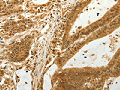 The image on the left is immunohistochemistry of paraffin-embedded Human colon cancer tissue using CSB-PA990609(RAB26 Antibody) at dilution 1/80, on the right is treated with synthetic peptide. (Original magnification: ×200)