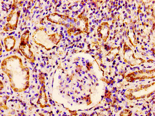 IHC image of CSB-PA621861LA01HU diluted at 1:300 and staining in paraffin-embedded human kidney tissue performed on a Leica BondTM system. After dewaxing and hydration, antigen retrieval was mediated by high pressure in a citrate buffer (pH 6.0). Section was blocked with 10% normal goat serum 30min at RT. Then primary antibody (1% BSA) was incubated at 4°C overnight. The primary is detected by a biotinylated secondary antibody and visualized using an HRP conjugated SP system.