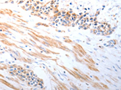 The image on the left is immunohistochemistry of paraffin-embedded Human esophagus cancer tissue using CSB-PA283902(RAD51 Antibody) at dilution 1/30, on the right is treated with synthetic peptide. (Original magnification: ×200)